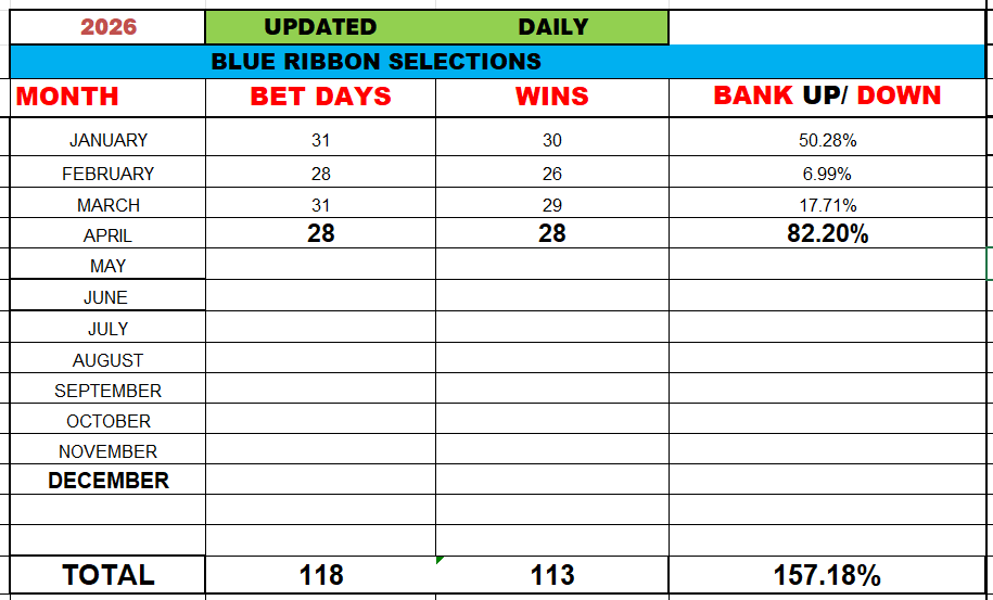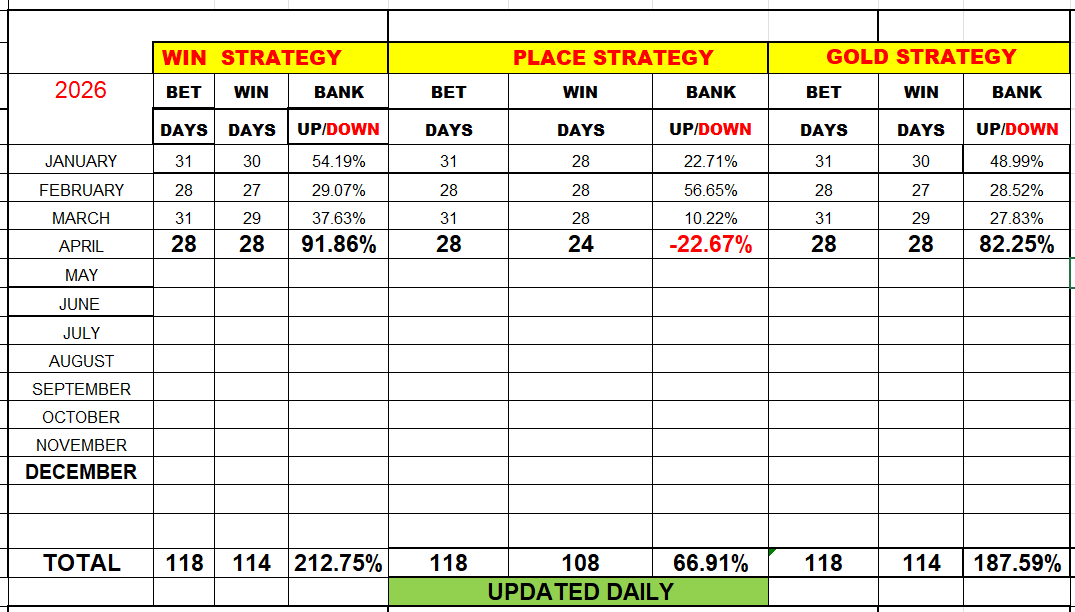 I’m winning, can’t remember when I started but gone from 1k to 3k. I do increase the start bank every day, and totally automated it using betfair Keep this tips coming, you strike rate is epic!